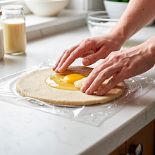Add 60 g of beaten egg (1 egg) to the mixture and quickly knead the dough with a spatula or your hands. If the mixture is too dry, add one tablespoon of cold water at a time until the dough comes together. Shape into a flat disk, wrap in plastic wrap, and chill in the refrigerator for 25-30 minutes.