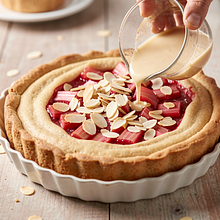 A delicate tart with seasonal rhubarb, prepared on a gluten-free crumbly base made from millet and rice flour. The combination of slightly tart rhubarb with creamy cream and subtle sweetness of sugar creates a contrast of textures: crumbly crust, moist aromatic filling, and crunchy almond flakes as an optional finishing touch. This is a modern take on a Polish spring dessert — perfect for an afternoon gathering, tea time, or a festive table. Serve slightly chilled, with a spoonful of thick natural yogurt or vanilla ice cream; it looks impressive on the plate thanks to the pink pieces of rhubarb and the golden crust.