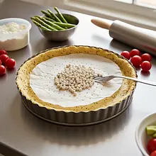 Prick the bottom of the dough in the form with a fork. Cover the dough with a sheet of baking paper and weigh it down with special ceramic balls, dry beans, or rice. Place it in the preheated oven and bake for 15 minutes. After that time, carefully remove the paper with the weights and bake for another 10-12 minutes, until the bottom is dry and lightly golden. Remove from the oven and set aside to cool slightly.