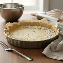 Ten proces to 'ślepe pieczenie'. Zapobiega wybrzuszaniu się spodu i gwarantuje, że będzie on w pełni upieczony i chrupiący, a nie zakalcowaty od wilgotnego nadzienia. Obciążenie musi dobrze wypełniać całą formę, aż po brzegi.