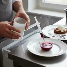 Wyjmij schłodzony olej z zamrażarki. Nabierz ciepły (ale nie wrzący) płyn buraczany do strzykawki bez igły, pipety lub buteleczki z małym dozownikiem. Trzymając dozownik około 10-15 cm nad powierzchnią oleju, powoli wkraplaj płyn do zimnego oleju, kropla po kropli. Zobaczysz, jak kropelki opadają na dno, tworząc małe, żelowe kuleczki.