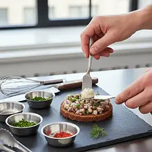 To wykwintna i nowoczesna przystawka, która czerpie inspirację z tradycyjnej polskiej kuchni wigilijnej. Klasyczny tatar ze śledzia zyskuje tu nowe oblicze dzięki podaniu na chrupiącym pumperniklu. Aksamitny mus chrzanowy dodaje delikatnej ostrości i kremowej konsystencji, idealnie równoważąc słony smak ryby. Prawdziwą gwiazdą jest jednak 'kawior' z buraka – małe, błyszczące perełki o słodko-ziemistym smaku, które nie tylko pięknie wyglądają, ale też dodają zaskakującego elementu tekstury i smaku. Danie jest niezwykle efektowne wizualnie, łącząc głęboki brąz pumpernikla, biel musu, srebrzystość śledzia i rubinową czerwień kawioru. Idealnie sprawdzi się jako elegancki starter na kolacji wigilijnej lub innym uroczystym przyjęciu, zachwycając gości zarówno smakiem, jak i wyglądem.