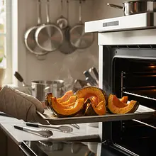 Preheat the oven to 200°C (fan) or 220°C (top and bottom). Thoroughly wash the pumpkin, then carefully cut it in half. Use a large, sharp spoon to scoop out the seeds and fibers. Place the pumpkin halves on a large baking sheet lined with parchment paper, skin side up. Put them in the preheated oven and bake for about 30-40 minutes. The pumpkin is ready when a fork easily pierces the flesh and the skin is slightly wrinkled.