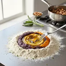 Using a fork, start gently mixing the wet ingredients in the center of the 'volcano'. Gradually, in a circular motion, incorporate the flour from the inner walls into the center until a thick, sticky mass forms. Once most of the flour is combined with the ingredients, set the fork aside and begin kneading the dough with your hands.