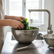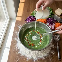 Start by preparing the 'green base' for the dough. Rinse the spinach leaves thoroughly under cold running water to remove any sand. Gently pat them dry with a paper towel. Place the washed spinach in a tall blender jar or in a bowl if you are using an immersion blender. Pour in all 500 ml of milk. Blend on high speed for about 1-2 minutes until you achieve a completely smooth, uniform liquid with a vibrant green color. There should be no visible pieces of leaves.
