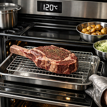 Preheat the oven to 120°C (conventional mode). Place the steak on a rack over a baking tray (to allow air circulation) and put it in the oven. Bake until the internal temperature of the meat reaches about 50–52°C (for medium-rare) — this may take 40–60 minutes depending on thickness. Use a meat thermometer inserted into the thickest part of the meat, avoiding contact with the bone.