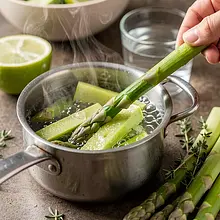 Cooking and infusion: In a pot with a diameter of 18–20 cm, bring 250 ml of water to a boil. Add the chopped asparagus (without the tips) to the boiling water and reduce the heat so that the water barely simmers. Cook for 6 minutes - the pieces should become intensely green and tender when pierced with a fork, but not falling apart. Remove the pot from the heat and let it cool for 5 minutes.