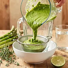 Blending and straining: transfer the cooled asparagus along with the cooking water to a blender. Add one third of the thyme leaves (remove the leaves from the stems) and blend on high speed for 40–60 seconds until smooth, green purée. Strain the mixture through a fine sieve or cloth (cheesecloth) into a bowl, pressing with a spoon to obtain a clear concentrate. You should get about 180–220 ml of liquid.