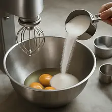 In a large bowl, place 240 g of eggs and 150 g of granulated sugar. Use a stand mixer with a whisk attachment (or a hand-held electric mixer). Beat on high speed for 8–10 minutes until the mixture becomes light, creamy, and significantly increases in volume — when you lift the whisk, the mixture should fall in wide ribbons (the so-called 'ribbon stage').