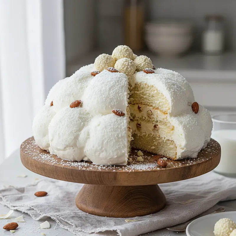 The Raffaello Cloud Cake is an incredibly light and elegant no-bake dessert inspired by the flavor of the iconic pralines. Its essence is a delicate, fluffy mousse made from white chocolate, mascarpone cheese, and coconut milk, which literally melts in your mouth. The base of the cake is a crunchy layer of toasted almonds and coconut flakes, providing the perfect contrast to the creamy filling. Hidden in the heart of each serving is a surprise – a whole blanched almond, reminiscent of the original. The entire cake is generously coated with coconut flakes, giving it the appearance of a snow globe. This dessert delights not only with its taste but also with its appearance, making it perfect for special occasions, parties, or as a sophisticated finale to a festive dinner. Its preparation, although requiring a bit of patience due to the cooling time, is within reach even for beginner bakers.