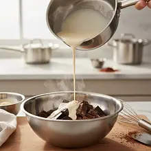 Zalej gorącą śmietanką posiekaną czekoladę w misce. Upewnij się, że cała czekolada jest przykryta. Przykryj miskę talerzykiem i odstaw na 5 minut bez mieszania. Ciepło śmietanki musi mieć czas, aby wniknąć w głąb czekolady i ją roztopić.