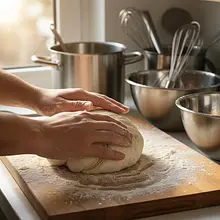 When the dough starts to come together, transfer it to a lightly floured surface or countertop. Knead by hand for about 5-7 minutes, until the dough is smooth, elastic, and no longer sticky to your hands. The dough will be warm and very pliable. Shape it into a ball, slightly flatten it, wrap it in plastic wrap, and place it in the refrigerator for at least 30 minutes.