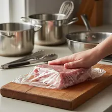 Teraz przygotuj kotlety. Każdy plaster schabu połóż na desce do krojenia. Przykryj go kawałkiem folii spożywczej lub woreczkiem śniadaniowym. Używając tłuczka do mięsa (najlepiej gładką stroną), delikatnie, ale stanowczo rozbijaj mięso od środka na zewnątrz, aż kotlet będzie miał grubość około 0.5 cm. Staraj się rozbijać równomiernie, aby kotlet nie miał dziur.