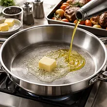In a medium-hot skillet (diameter 26-28 cm), melt 25 g of butter and add a tablespoon of oil. Sear the pork loin on all sides until golden brown (about 2-3 minutes per side). Once the pork loin has a nice, caramelized crust, transfer it to the vegetables in the baking dish, and top it with the remaining apple slices and chopped onion.