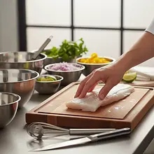 Użyj oddzielnej deski do krojenia ryb, aby uniknąć przenoszenia zapachów i bakterii. Ostry nóż jest kluczowy – tępy będzie miażdżył delikatne mięso ryby. Unikaj metalowych misek, ponieważ kwas z limonek może wejść z nimi w reakcję, nadając potrawie metaliczny posmak.