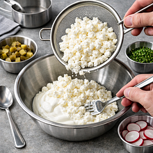 Take the cottage cheese out of the fridge and assess its consistency. If it is clearly watery (liquid separates in the package), prepare a sieve and a bowl lined with cheesecloth or a clean cloth. Place the sieve over the bowl, transfer the cottage cheese to the cheesecloth, and set aside for 8–10 minutes to allow the excess whey to drain. This will prevent the dish from being watery and will give it a thicker consistency.