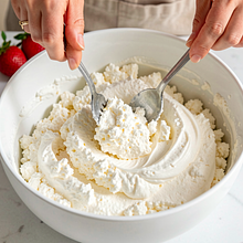 Add 40 g of honey to the cottage cheese in a thin stream and mix for 30-45 seconds with a whisk or fork to evenly distribute the honey. The combined ingredients should form a smooth, slightly glossy mixture. Taste and sweeten with an additional teaspoon of honey if needed.