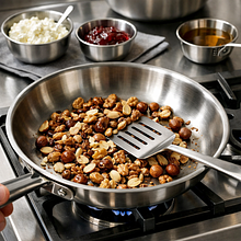 If you want to roast the nuts: heat a dry skillet over medium heat (the best skillet is 20-24 cm). Pour the nuts into the skillet and stir with a wooden spoon every 30 seconds for 2-3 minutes, until they start to smell nutty and lightly brown. Set aside on a plate to cool and chop with a kitchen knife into smaller pieces.