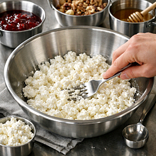 Take the cottage cheese out of the fridge for 5-10 minutes to reach a cool but not cold temperature — it will crumble and mix more easily. Prepare two small bowls or one large bowl for mixing. Measure out the honey, jam, nuts, and optional flakes and seeds.