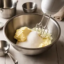 In a separate large bowl, place 200 g of soft butter and 180 g of white sugar. Beat with a paddle attachment on medium speed for 2–3 minutes until the mixture becomes light, fluffy, and creamy — when you stop the mixer, the mixture should slowly fall from the beaters in a smooth ribbon. If you are beating by hand, use a wooden spoon and vigorously mix for 6–8 minutes.