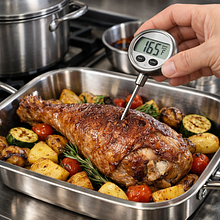 Check the internal temperature of the meat: insert the tip of the thermometer into the thickest part of the thigh, avoiding the bone. The safe temperature for turkey is 74°C (inside). If the meat has not reached this temperature, continue baking in 5-10 minute intervals and check the temperature.