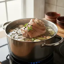 During cooking, foam (known as scum) may form on the surface. You can skim it off with a slotted spoon to make the broth clearer. It is crucial to cook very slowly - a vigorous boil will make the meat tough.