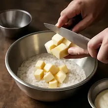 Cut 140 g of cold butter into cubes about 1 cm on each side and place it in a bowl with the flour. Rub the butter with your fingers or use a pastry cutter until the mixture resembles fine crumbly bits (the size of pea grains).