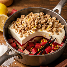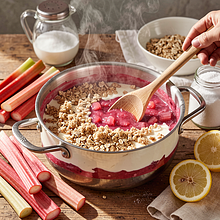 A light, spring dessert combining tangy, fresh rhubarb with fluffy cream and crunchy oat crumble. The idea comes from a modern interpretation of Polish flavors: rhubarb as a seasonal highlight, curd and cream as elements of traditional dairy, and oats instead of classic flour crumble. The dessert is served in glasses or bowls as an elegant finale to a meal; it pairs wonderfully with green tea, light sparkling wine, or coffee. Qualities: contrast of textures (soft, moist compote vs. crunchy crumble), contrast of flavors (tartness of rhubarb vs. sweetness of cream), and a beautiful, layered presentation in pastel colors of spring.