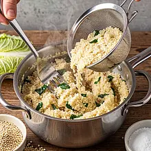 Rinse the millet under running water in a fine sieve until the water runs clear. Place the millet in a pot, cover with 2.5 times its volume of water (about 500 ml), add 1 g of salt, and bring to a boil. Cook covered on low heat for 12-15 minutes, until the water is absorbed and the millet is fluffy. After cooking, let it sit covered for 5 minutes, then fluff with a fork.