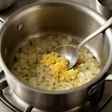 To the translucent onions, add 15 g of garlic and 20 g of grated ginger. Sauté for 1-2 minutes, stirring frequently, until the aroma of garlic and ginger becomes pronounced (do not let the garlic brown, as it will become bitter). Then add 10 g of curry powder, 5 g of turmeric, and 5 g of cumin. Stir the spices with the onions for 30-45 seconds, until they release their fragrance and lightly "toast."