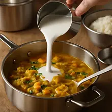 Pour 400 ml of coconut milk into a pan, gently stir, bring to a gentle boil, then reduce the heat and cook for 6-8 minutes uncovered, until the sauce becomes creamy. Season with salt (3 g) and pepper (2 g). Taste and adjust with more curry or salt if needed.