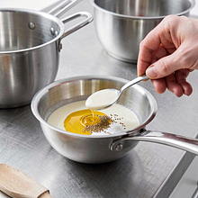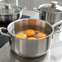 Place the eggs in a pot with a diameter that allows them to lie in a single layer. Cover with cold water so that it is about 2 cm above the eggs. Bring to a boil over high heat. Once the water starts to boil, reduce the heat to maintain a gentle simmer, and cook for 9 minutes to achieve hard-boiled eggs with a creamy yolk. After 9 minutes, transfer the eggs to cold water and place them in a bowl of ice-cold water for 5 minutes — this stops the cooking process and makes peeling easier.