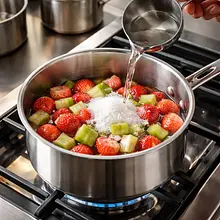 Prepare the ingredients: rinse the strawberries, remove the stems; wash the rhubarb and trim the tough ends. Cut the rhubarb into 1-1.5 cm pieces, and halve or quarter the strawberries if they are large. Weigh out 45 g of sugar (from the total of 60 g) and prepare 100 ml of water.