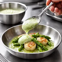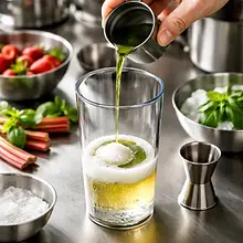 In a tall blending container, place the aquafaba (120 ml), 15 g of sugar, 50 ml of chilled basil infusion, and a pinch of salt (1 g). Use a hand blender or a hand mixer with a whisk attachment and whip on the highest speed for 1.5–3 minutes until a shiny, stable foam with soft peaks forms. The foam should be thick, hold its shape, and have a grainy-smooth texture. If using a jug blender, blend in pulses to aerate, then transfer to a bowl and whip by hand.