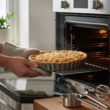 Place the cake in the preheated oven. Bake for about 50-60 minutes. The cake is ready when the crumble is deep golden brown and the fruit juices at the edges of the pan are bubbling vigorously. If the top starts to brown too quickly, loosely cover it with aluminum foil.