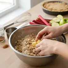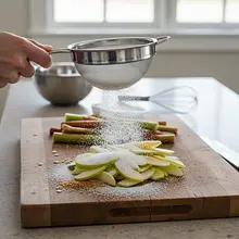 On a large work surface or in a wide bowl, sift 300g of all-purpose flour. Add 100g of powdered sugar and a pinch of salt. Mix the dry ingredients. Take 150g of very cold butter out of the fridge, cut it into small cubes (about 1x1 cm), and add it to the flour. Using a knife or a special pastry cutter, vigorously chop the butter into the flour until the mixture resembles wet sand or semolina. The goal is to warm the butter as little as possible with your hands.