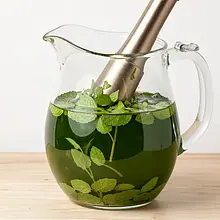 In a large pitcher (1.5–2 l), place the chopped sorrel and 200 ml of cold water. Use a cocktail muddler or the end of a wooden spoon to gently crush the leaves for about 30 seconds to release the juices and aromas. After crushing, pour in the remaining water (1300 ml).