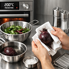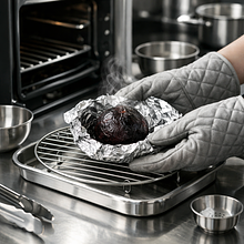 Preheat the oven to 200°C. Wash the beetroot, remove the leaves (if any), and dry it with a paper towel. Wrap the beetroot tightly in aluminum foil (single layer) and place it on a baking sheet or in a baking dish. Bake for 30–35 minutes in the middle of the oven. Check with a fork: the beetroot is ready when a knife goes in easily without resistance.