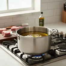 Do zredukowanego wina i warzyw włóż z powrotem obsmażone policzki wołowe. Wlej gorący bulion wołowy, tak aby mięso było prawie całkowicie przykryte. Dodaj liście laurowe, ziele angielskie i gałązki świeżego tymianku. Doprowadź całość do wrzenia, a następnie natychmiast zmniejsz ogień do absolutnego minimum.
