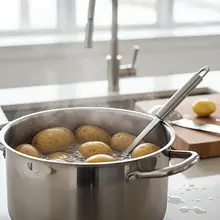 W czasie, gdy mięso się dusi, przygotuj knedliki. Ziemniaki dokładnie umyj i ugotuj w mundurkach w osolonej wodzie do miękkości (około 20-30 minut, w zależności od wielkości). Sprawdź gotowość, nakłuwając je widelcem – powinien gładko wchodzić. Odcedź ziemniaki i, gdy są jeszcze gorące, obierz je ze skórki. Natychmiast przeciśnij je przez praskę do ziemniaków lub dokładnie utłucz tłuczkiem. Rozłóż na dużej tacy i pozostaw do całkowitego ostygnięcia.