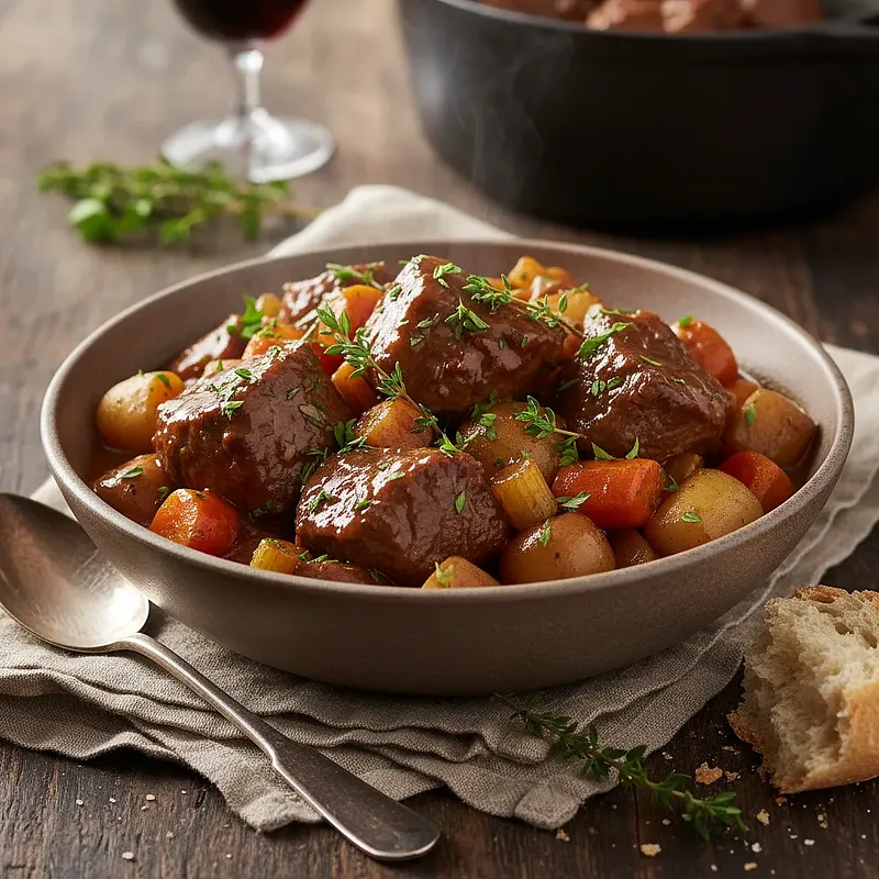 Podawaj gorącą wołowinę z kremowym purée ziemniaczanym, które doskonale wchłonie bogaty sos. Inne świetne dodatki to kluski śląskie, kopytka, kasza gryczana lub pęczak. Niezbędna jest również kromka chrupiącego wiejskiego chleba lub bagietki do wytarcia talerza do ostatniej kropli sosu. Do picia idealnie pasuje kieliszek tego samego czerwonego wina, które zostało użyte do gotowania.
