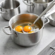 Place 2 eggs in a medium pot and cover them with cold water so that the water is about 2 cm above the eggs. Put the pot on high heat and bring the water to a boil. Once the water starts boiling vigorously, reduce the heat to medium and cook for 9 minutes to achieve hard-boiled eggs with a creamy yolk. After the time is up, quickly transfer the eggs to a bowl of very cold water for 5 minutes — this will make peeling easier.