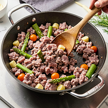 Add 400 g of ground pork to the pan. Break up the meat with a spoon and fry for 6–8 minutes over medium heat, until it changes color and starts to brown slightly. Stir every 1–2 minutes to create small, even pieces of meat.