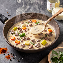 Pour 150 ml of vegetable broth and 150 ml of 18% cream into the pan. Add 5 g of salt, 2 g of pepper, and 2 g of sweet paprika. Simmer on low heat for 6–8 minutes, stirring occasionally, until the sauce thickens and the flavors meld together. If the sauce seems too thick, add a little of the reserved pasta cooking water (1–2 tablespoons at a time).