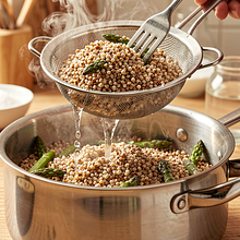 Prepare the buckwheat: place the buckwheat in a sieve and rinse under cold running water, shaking the sieve until the water runs clear (about 30-60 seconds). Then transfer the buckwheat to a medium pot and add 400 ml of water. Add 1 pinch of salt. Place the pot over medium heat, cover with a lid, bring to a boil, reduce the heat to low, and cook for 12-15 minutes without stirring, until the water is absorbed. After cooking, remove from heat and let it sit covered for another 5 minutes, then fluff with a fork.