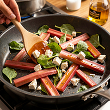 Heat a 24-26 cm skillet over medium heat. Pour in 1 tablespoon of canola oil (15 g). When the oil starts to shimmer, add the chopped rhubarb and sauté for 2 minutes, stirring with a spatula, until the rhubarb begins to soften and release its juices. Add 1 tablespoon of honey (15 g) and 1 tablespoon of wine vinegar (15 ml) along with a pinch of salt and pepper. Sauté for another 2-3 minutes until the rhubarb is soft but still holds its shape — it should be tender-tart, not mushy.
