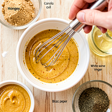 In a small bowl, combine 1 tablespoon of mustard (15 g) with 1 tablespoon of honey (15 g) and 1 tablespoon of wine vinegar (15 ml). Add 2 tablespoons of rapeseed oil (30 g). Whisk vigorously with a whisk or fork for 20-30 seconds until the dressing becomes smooth and slightly thick (emulsion). Season with 1-2 pinches of salt (2 g) and 1 pinch of pepper (1 g). Taste and adjust the proportions if necessary: more vinegar for sharpness, more honey for sweetness.