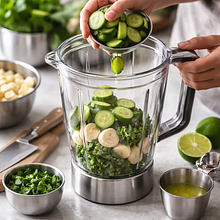 Wash the cucumber under running water with a vegetable brush, and dry it with a paper towel. If the skin is thick or waxed, peel it thinly with a peeler; otherwise, leave the skin on for extra color and fiber. Cut the cucumber into thick slices (about 1–1.5 cm) to make it easier to throw into the blender.