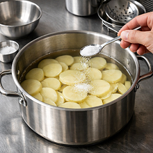 In a large pot, place the potato slices and cover them with cold water. Add 2 g of salt (about 1/2 teaspoon). Bring to a boil over high heat, then cook for 4–5 minutes from the moment it boils - the goal is to lightly parboil (blanch), the slices should still be firm and not break apart. After 4-5 minutes, drain the potatoes in a colander and rinse with cold water to stop the cooking process; set aside in the colander to cool slightly and dry.