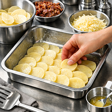 Wash the potatoes under running water. If the skin is dirty or uneven, peel it thinly with a peeler, but you can also leave the skin on for a rustic touch. Cutting: slice the potatoes into very thin slices, 2–3 mm thick. The quickest way to do this is with a mandoline set to a thin setting; if you don't have a mandoline, use a sharp knife and cut with care – hold the potato with your fingers curled to protect your fingertips.